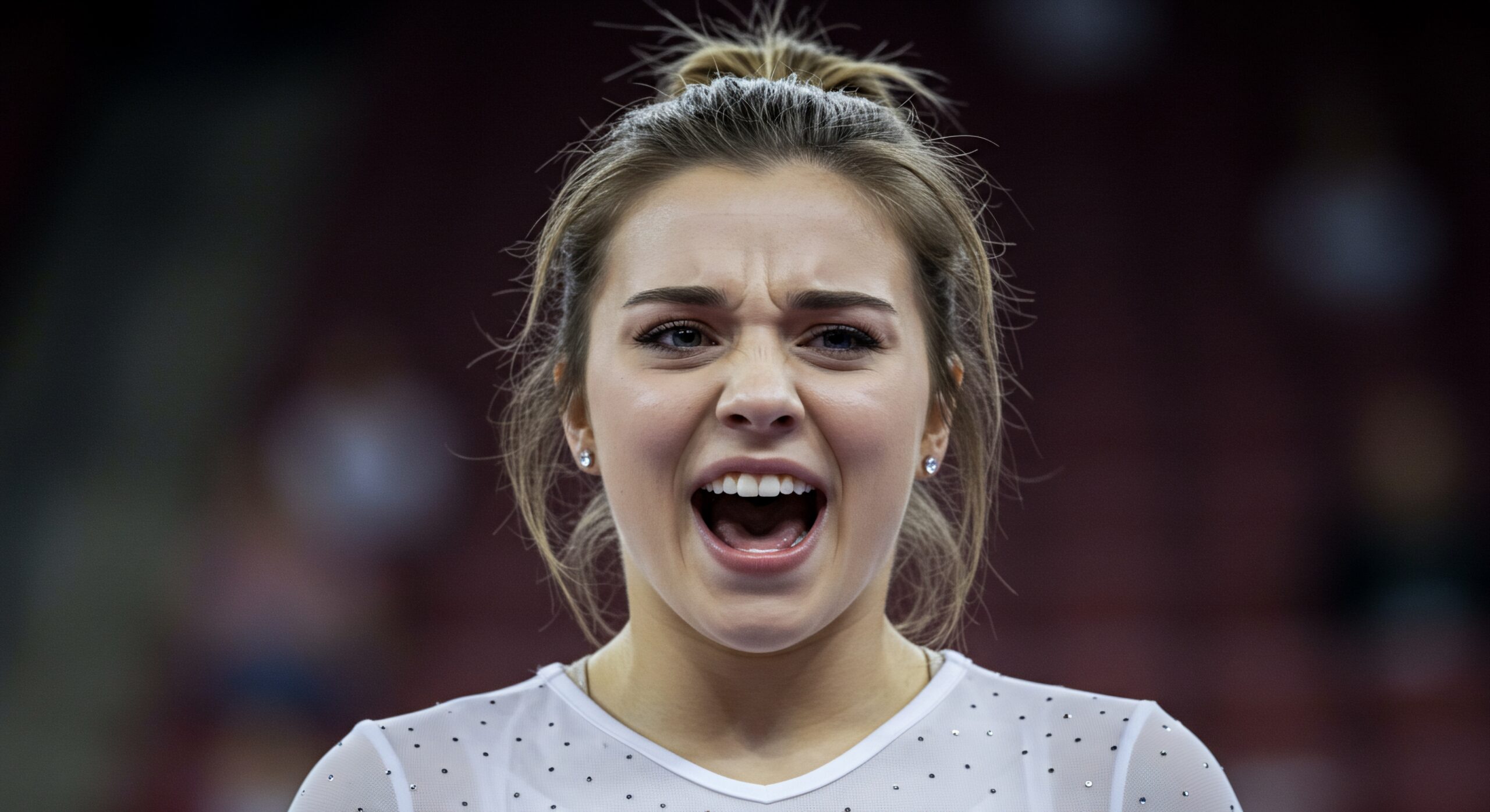 Expressive gymnast screams fiercely in stadium
